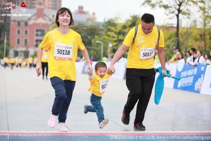亲子组比赛虽然只有1.5公里,但对年纪尚小的孩子们来说是不小的挑战,3岁的陈禹铭拒绝父母用推车带他跑,坚持自己跑完了整个赛程。陈禹铭的爸爸表示,自己已经连续3年参加昆马,今年报名亲子跑,“就想带着孩子一起跑,从小培养他对运动的兴趣,明年也要来,最好年年来!”陈禹铭的妈妈说:“他说要自己坚持跑完的时候我们特别欣慰,其实做父母的过程,就是和孩子一起成长的过程。虽然有点累,但是很开心,因为可以带孩子一起体验健康的生活方式。”